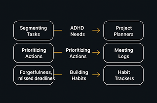 In the framing stage, I established my digital artefact in ADHD executive-function research to maximise social utility. Drawing from Sibley et al.’s study on organisational skills, time management and planning difficulties, I identified the core areas my template can address, such as clear task segmentation. Parker's research influenced my decisions to include ready-to-use interventions such as daily checklists and motivational prompts to inform my modular block design. Guided by the module 2 insights, I mapped out potential features, like habit trackers, task lists and timing structures, and decided to form distinct Notion databases to separate personal and academic life. This research-driven framing ensured each area served a target need and formed a cohesive and reusable system.