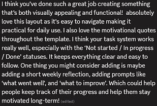 In the testing stage, I published the evolving template online, sharing it with the BCM114 Discord community and local university peers, gathering qualitative feedback on clarity, difficulties, perceived value and suggested features. This allowed me to understand unnecessary sections, leading me to streamline the layout, removing redundant areas, thus reinforcing the template’s social utility and tailoring for neurodiverse users. This stage strengthened my template in not only becoming scalable across workflows, but also in resonating with its community-based audience.